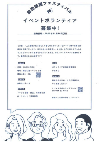 連絡いただくか、電話番号 0944-53-6919よりお願いいたします。皆さまのご応募お待ちしています。動物が好きな方大歓迎です。
