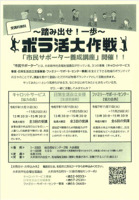 「市民サポーター」とは大牟田社会福祉協議会が行っている3つの事業を支えてくださっている地域のボランティアの方々のことです。講座を受けて登録していただくと、有償ボランティアとして活動が出来ます。
