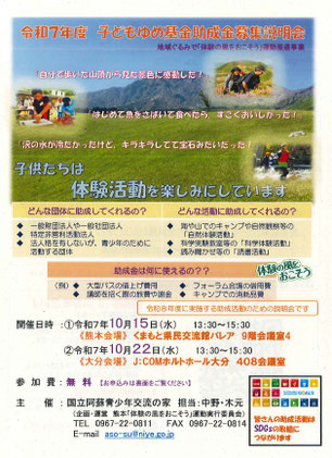 熊本会場、大分会場の参加申込みは令和7年9月30日までです。詳しくは子どもゆめ基金公式ホームページの説明会情報をご確認ください。