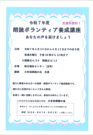 ★申込・問合せ:令和6年4月17日までに、大牟田朗読の会 塚本(090-7380-3500)へお願いします。